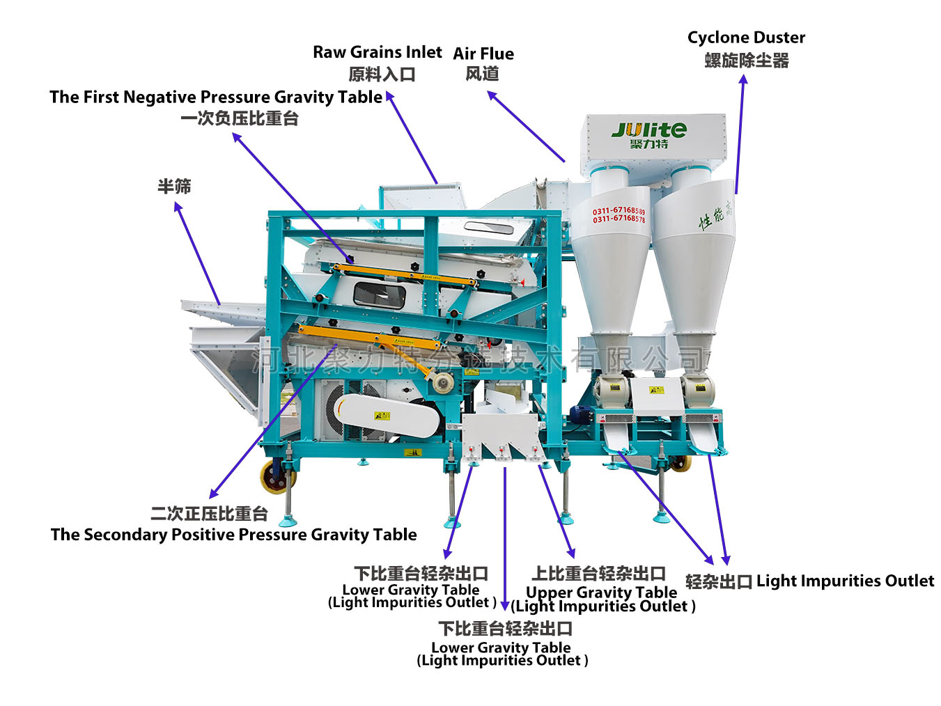 物料通過提升機經(jīng)喂入斗進入第一道負壓比重臺,通過風選去除物料中的粉塵、糠殼等輕雜質(zhì),輕雜經(jīng)風道、旋風除塵器,由閉風器排出;通過比重選有效去除物料中的秸稈、軸芯等比重較輕的雜質(zhì)。然后物料通過導糧機構進入第二道正壓比重臺,通過調(diào)整風量、擋板位置等進行比重加工,去除物料中的碎粒、秕籽、芽粒、蟲蛀粒、霉變粒等雜質(zhì),最終成品從比重臺高處排出。