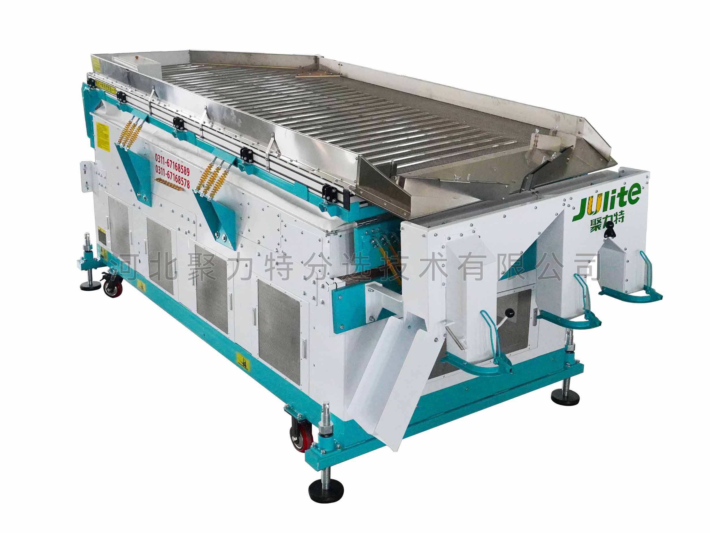 根據(jù)物料在空氣動力和振動摩擦力雙重作用下產(chǎn)生比重偏析的原理。通過調(diào)整風壓、振動頻率等技術(shù)參數(shù),使比重較大物料沉到底層,靠振動篩面產(chǎn)生的摩擦力向高處運動,比重較小的物料經(jīng)氣流作用懸浮在表面向低處流動,以達到按比重分離的目的。