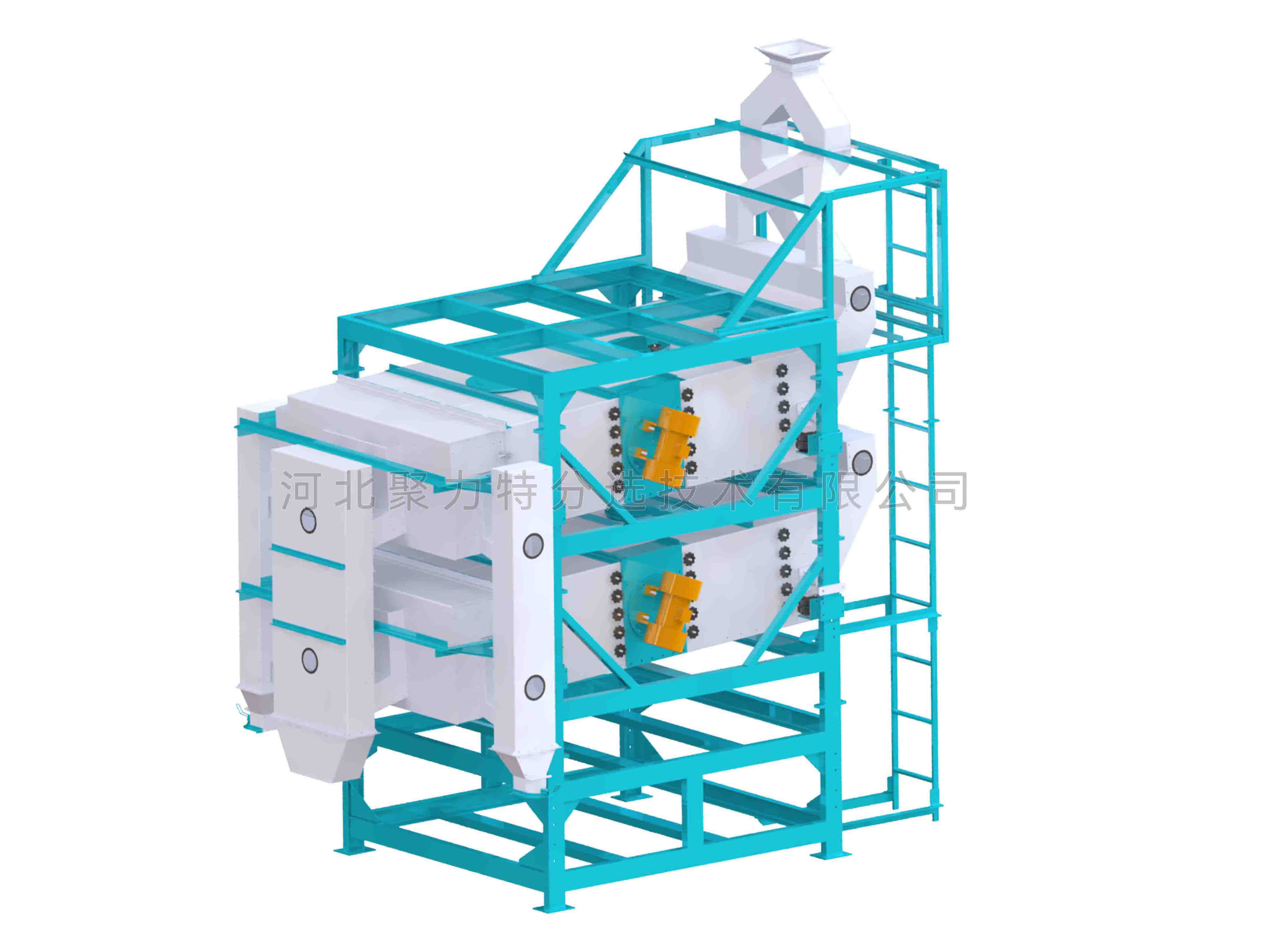5XFJ-20AS 振動分級篩物料經過三通分流至上下兩個篩箱,進入篩箱后通過分料裝置將糧食再次分為兩份,在一個大篩箱中的兩個小篩箱內同時加工,一臺設備等同于原來4臺設備,使產量和效率是原來的3一4倍.