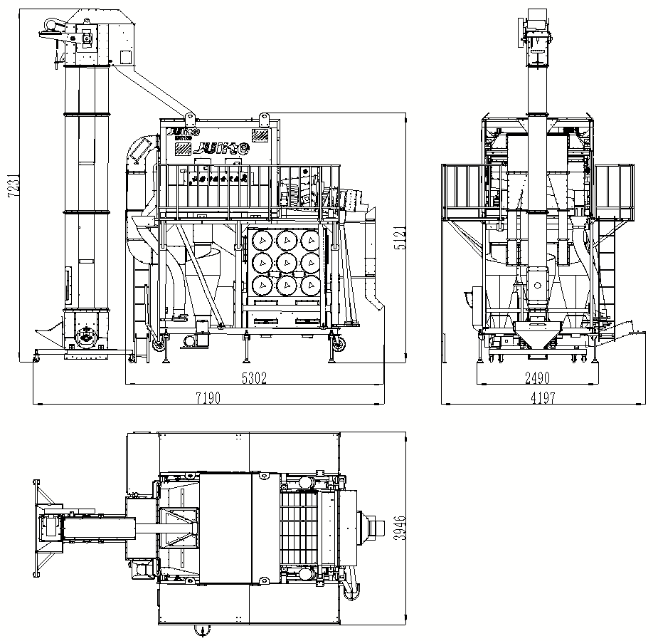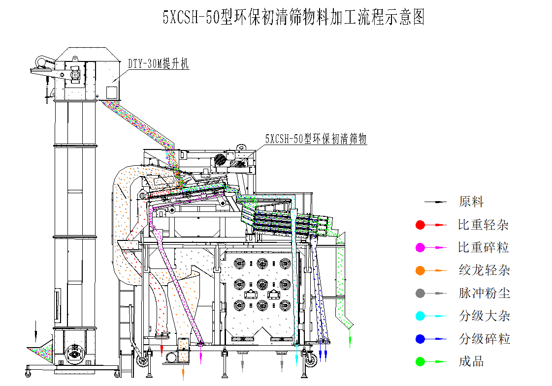 5XCSH-50環(huán)保初清篩主要由上下兩部分結(jié)構(gòu)組成,其中上部分功能為臥式比重風(fēng)選、分級(jí),下部分功能為二級(jí)除塵;物料首先經(jīng)喂入斗進(jìn)入臥式風(fēng)選比重臺(tái),通過臥式比重風(fēng)選分離去除物料中的粉塵、糠殼、碎秸稈、玉米軸芯等輕雜,其中含塵氣體經(jīng)旋風(fēng)除塵器完成一級(jí)除塵,去除粉塵、糠殼等輕雜,經(jīng)過一級(jí)除塵的細(xì)小粉塵空氣進(jìn)入脈沖除塵器完成二級(jí)除塵,去除更細(xì)小的粉塵,達(dá)到合規(guī)潔凈排放。臥式比重風(fēng)選分離后的物料進(jìn)入一層大雜篩去除大雜,然后并行進(jìn)入四層小雜篩去除小雜,排出成品。