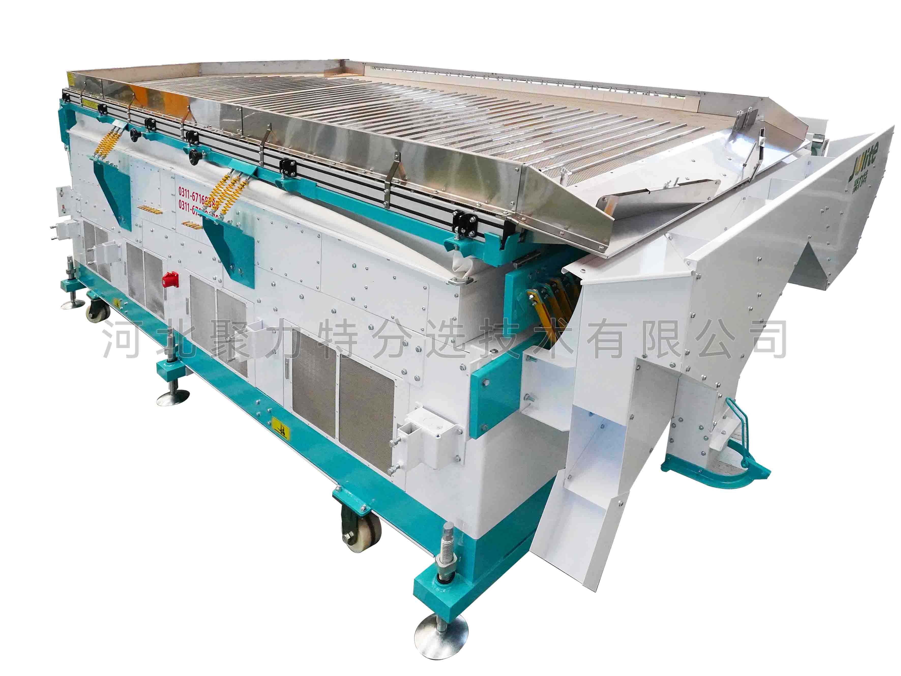 根據(jù)物料在空氣動(dòng)力和振動(dòng)摩擦力的雙重作用下產(chǎn)生比重偏析的原理。通過(guò)調(diào)整風(fēng)壓、振動(dòng)頻率等技術(shù)參數(shù),使比重較大的物料沉到底層,靠振動(dòng)篩面產(chǎn)生的摩擦力向高處運(yùn)動(dòng),比重較小的物料經(jīng)氣流作用懸浮在表面向低處流動(dòng),以達(dá)到按比重分離的目的。